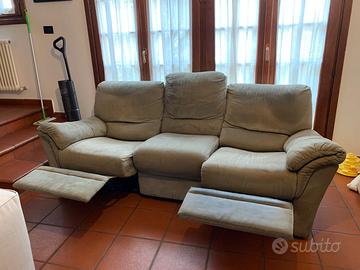 05.02.26 Regalo divano datato anni 2000 misure 220 x 90 cm circa, colore verde oliva, con due alzate meccaniche funzionanti, presenta aloni coperti da copridivano.