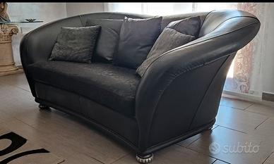 Causa rinnovo arredamento, vendo divano in vera pelle, marchio Essepi Imbottiti mod Vedette, 3 posti, colore nero, piedini arrotondati in tinta grigia e venature nere.