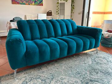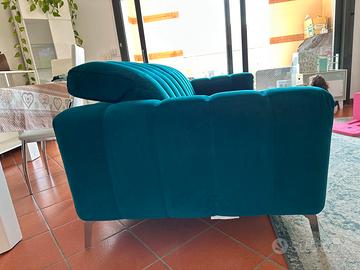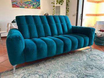 Vendo per imminente trasloco divano in velluto di colore verde/blu petrolio con schienale reclinabile, in condizioni perfette.