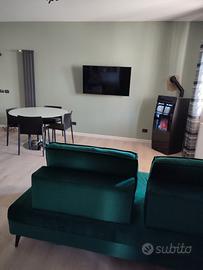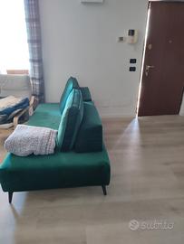 Divano verde praticamente nuovo! Solo 3 anni, di cui uno chiuso in taverna mai usato. Bellissimo, le spalliere sono zavorrate e ben solide,l'unica pecca che ha dei graffi fatti dal mio cane.