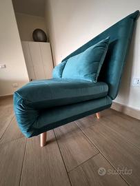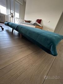 Ha le gambe in legno e può diventare un divano letto d’emergenza. Colore verde petrolio . Spedizione e ritiro a carico dell’acquirente .