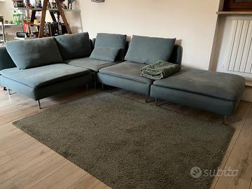 Divano componibile Ikea soderhamn, composto da 2 elementi da 1 posto, 1 elemento angolare, 1 poggiapiedi, si può comporre in base alle proprie esigenze di spazio, così com’è occupa 190 cm il lato più corto e 285 il lato lungo, la profondità é 99 cm