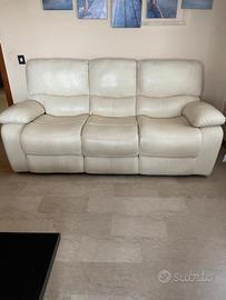 Tre posti, in pelle, colore avorio con due meccanismi relax regolati da un sistema meccanico