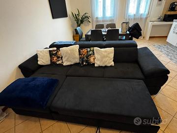 Divano angolare colore blu scuro buonissime condizioni causa trasloco devo venderlo per motivi di spazio. Il divano ha 2 anni di vita ha il contenitore porta tutto e un espanzione a un letto matrimoniale, con testiere regolabili in base all’esigenza.