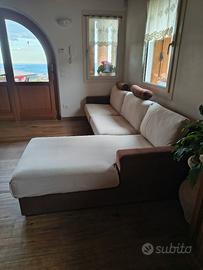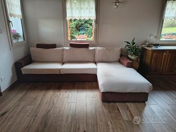 divano colore marrone con cuscini arancioni. Con possibilità di telo copridivano,come da foto,panna. misure : lunghezza compresa chiase longue 3 metri x 2