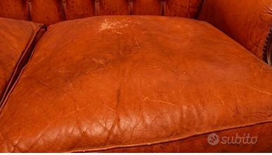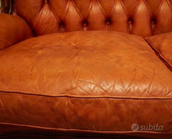 Divano vintage a due posti (dovrebbe essere in vera pelle), colore marrone/cognac, con lavorazione capitonné sullo schienale.