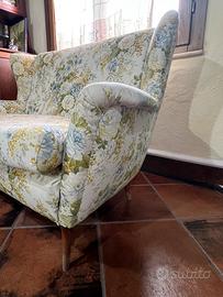 Elegante divano vintage a due posti, originale anni ’60/’70, con raffinato rivestimento floreale nei toni del panna, verde e azzurro.