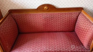 Vendesi elegante divano d'epoca caratterizzato da una solida struttura in legno massello con finitura lucida. Il mobile presenta linee pulite e classiche, con uno schienale sagomato impreziosito da un dettaglio circolare intagliato al centro.