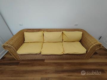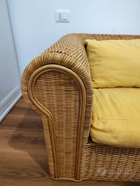 Divano vintage 3 posti in rattan, lungo 2 metri e 30, con intreccio resistente e duraturo che conferisce eleganza a qualsiasi spazio abitativo. Presenta un design curvilineo con linee morbide e rotonde che invitano alla seduta accogliente e avvolgente.