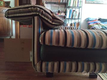 Struttura solida e resistente, seduta in pelle scura, schienali e braccioli ribaltabili, in tessuto.