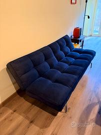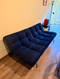Vendo divano moderno 3 posti colore blu, dal design pulito ed elegante. Dotato di schienale reclinabile che permette di trasformarlo facilmente in letto, ideale per ospiti o per piccoli spazi. Struttura solida con piedini in metallo e seduta comoda con lavorazione capitonné. Trasformabile in letto Design moderno Colore blu elegante e versatile Ottimo per salotto, studio o casa vacanze Condizioni molto buone, come da foto. Solo ritiro a mano.