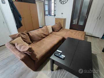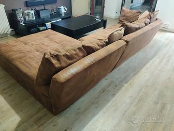 Spettacolare divano artigianale comodo praticamente come nuovo, composto da seduta regolare 2 posti molto larghi e chaise longue anch'essa larghissima. Color tabacco, tessuto microfibra effetto alcantara piacevolissimo al tatto, adatto a chi ha animali per resistenza ai graffi. Corredato da 2 cuscini lunghi dello stesso tessuto, 2 quadrati idem e 2 diversi ma ben assortiti. Vendo per imminente cambio arredo