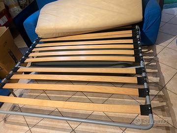 Divano letto in tapezzeria blu e cuscini gialli piu puffo coordinato. Struttura in otgime condizioni tapezzeria consumata . Ottimi ingranaggi di apertira e chiusura per il letto che e stato usato pochissimo. Prezzo trattabile