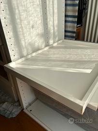 Tutto il sistema entra in un armadio Pax da 100cm x 60 cm. Da un lato ci stanno i 4 cassetti coperti dal top o altri accessori Ikea, dall’altro si inserisce il vassoio scorrevole e la mensola. Ideale per ante scorrevoli, così apri i cassetti senza aprire del tutto l’anta. Me ne separo a malincuore perchè non entrano in lunghezza nel mio nuovo armadio da 55. I cassetti Ikea sono più capienti di quelli degli armadi standard e questa misura è robusta (cassetti già venduti, prezzo abbassato di conseguenza)