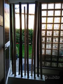 Separé con 2 basamenti in legno perforato bianchi per disporre 10 canne in bambù (marrone chiaro e marrone scuro). Larghezza: 97cm Altezza: 205cm Profondità: 30cm Smontabili per il trasporto