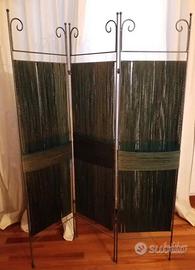 Separe’ divisorio artigianale, in ferro battuto Bellissimo pezzo d’arredo per abitazione o negozio Rivestimento in rafia annodato a mano ,verde scuro Pieghevole occupa poco spazio Come nuovo !!