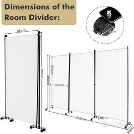 Divisorio Paravento 3 pezzi in stoffa bianca con ruote, struttura in ferro, misure 260 x 180 cm, pieghevole e autoportante.