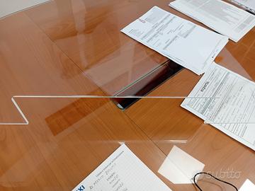 divisorio in plex, condizioni eccellenti, misure 60 di altezza a 100 di larghezza, buchetta centrale piuttosto ampia, non presenta graffi, si regge su due sostegni robusti e ben piazzati