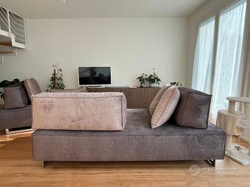 Vendo per acquisto errato, divano componibile che combina eleganza e funzionalità in un design contemporaneo. La struttura si presenta come una piattaforma mono-corpo sospesa su due slitte in metallo cromato conferendo leggerezza visiva e raffinatezza. Elemento distintivo del divano sono i due schienali mobili, dalla consistenza solida e dal peso calibrato, che possono essere posizionati liberamente lungo tutta la seduta. Questa caratteristica permette di riconfigurare il divano secondo le esigenze del momento, trasformandolo da comodo schienale per conversazioni frontali a appoggio laterale ideale per il relax. Il divano è praticamente pari al nuovo non mostrando alcun segno di usura. Perfetto per chi cerca un divano modulare di design italiano, elegante, versatile e funzionale per soggiorni moderni o spazi living di carattere.