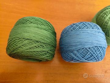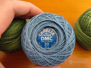 Cordonetto DMC Cebelia 100% cotone, n° 20, gomitoli da 50 grammi ciascuno, 370 m circa. Prezzo 6 euro a gomitolo Colori disponibili: - n° 2 verde - n° 1 azzurro