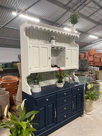 Credenza Dispensa bicolore, dove il blu intenso "OTTANIO" veste con eleganza la base, mentre la parte superiore, in bianco perla "VAPOROUS", si distingue per la sua luminosità e leggerezza. Stile provenzale con vetrine, piano in venato, completano il pezzo un elegante porta vino e un comodo porta calici. PEZZO UNICO !!!! Adatto anche a locali, ristoranti, bed and breakfast, casa vacanze e location per eventi Misure cm. 140x48x198 composto da due pezzi. Si dividono tra di loro facilmente per il trasporto. Per Visionarlo: 📍ZONA Roma nord vicino Cesano. 🚚Possibilità di trasporto fronte strada, da valutare dopo visione sul posto