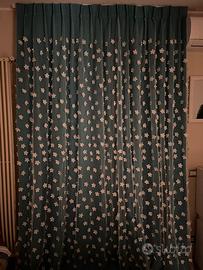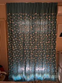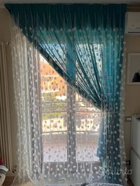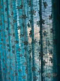 Doppia Tenda composta da un tessuto garzato di colore turchese e da un tessuto velato con applicazioni di fiori. Binario incluso.