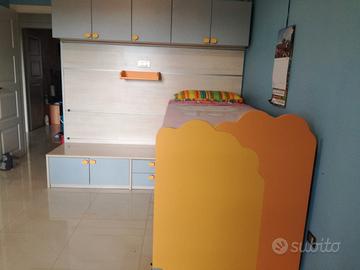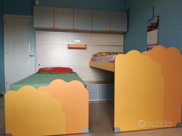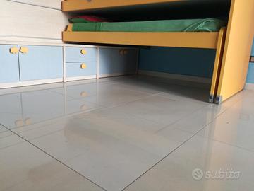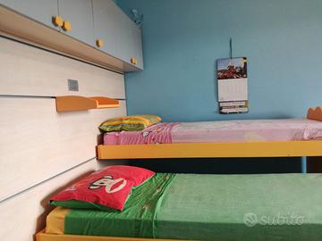 Doppio letto scorrevole uno sotto l'altro su boiserie (legno e binari a parete, come si vede in foto). Completo di mobiletto pensile a 5 ante e sotto ai letti mobiletto con 4 ante e 2 cassetti. Misura boiserie mt. 1.70 (altezza) mt. 2.20 (larghezza) circa. Sono custoditi già smontati zona piazza Aldo Moro a Foggia al 3 piano con ascensore. Se vieni a prenderlo te lo regalo. No perditempo.