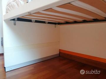 Due letti sovrapposti/scorrevoli marca Cia International (acquistati da Bovo Mobili Mestre) con doghe, esclusi materassi (già venduti) , struttura panna e legno, il letto inferiore con ruote si estrae ed è pronto all'uso, ruote con fermi x bloccarle, struttura portante solida con pannello laterale che la tiene salda e con rotelline alla base per facilitare lo spostamento. Ben tenuti (piccoli graffi sull'asse materasso superiore , graffio sul retro rete inferiore), misure 200x90 cm circa. Già smontato come da ultima foto . Zona Mestre (VE)