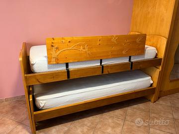 Vendo letto doppio con rotelline che facilitano lo spostamento. Comodo perché il secondo letto è facilmente estraibile ed è sempre pronto. Il tutto fatto dal falegname, presente qualche segno facilmente riparabile. letto sup.93x202,5x113 (altezza testiera) letto inf. 93x196,5x65 (altezza testiera).