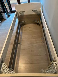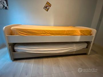 Doppio letto singolo. Entrambi i letti sono scorrevoli. il più basso va a scomparsa sotto l'altro. Reti a doghe. Colori bianco panna (letto n. 1) e tortora (letto n. 2).