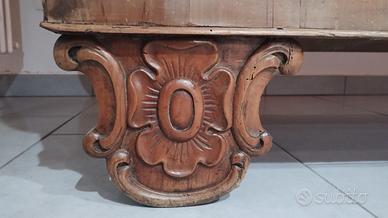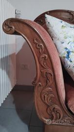 Descrizione del venditore Elegante dormeuse antica in noce intagliata, di grande impatto scenico, perfetta per valorizzare qualsiasi ambiente. Realizzata in Italia nei primi decenni del XX secolo, questa raffinata chaise longue si distingue per la sua linea sinuosa e armoniosa, con schienale sagomato e ricchi intagli decorativi a volute e motivi floreali, tipici del gusto Luigi Filippo reinterpretato in epoca successiva. I piedi scolpiti e le proporzioni equilibrate conferiscono al mobile una presenza importante e decorativa, adatta sia ad ambienti classici che a contesti più moderni in contrasto. La struttura è solida e autentica, realizzata con tecniche tradizionali, come visibile anche dalle immagini della costruzione interna con cinghie e imbottitura artigianale. Il legno di noce presenta una bella patina naturale, con segni del tempo coerenti con l’età che ne testimoniano l’autenticità. Il rivestimento in velluto, rifatto nel corso del Novecento, mostra segni di utilizzo ed è eventualmente da sostituire per una valorizzazione estetica completa. Oggetto decorativo di grande presenza, sempre più ricercato nel mercato dell’arredo vintage.