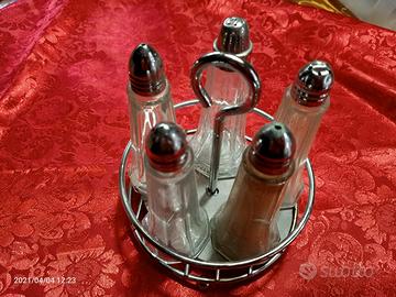 Elegantissimo contenitore rotondo per dosatori da tavola con N.5 pezzi da esporre in tavole imbandite per feste o eventi importanti e da ricordare.