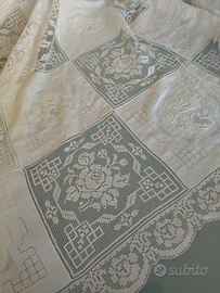 Bellissimo copriletto, tovaglia, telo arredo antico, in filato sottilissimo e lino con rose intagliate e ricamate. Bordato con ricamo su i quattro lati. Perfetto. Vero capolavoro d' artigianato di altri tempi. 2,40 x 2,60 circa