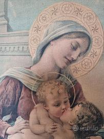MADONNA CON BAMBINO – DRAPPO-STENDARDO RELIGIOSO FINE ‘800 DI FORMA RETTANGOLARE TESO SU UN BASTONE IN RAME CON ESTREMITA’ CHIUSE DA CIPOLLE - CROMOLITOGRAFIA - RIPRODUZIONE SU TELA DELL'ORIGINALE - LO STENDARDO E' INCONICIATO DA PASSAMERIA CON FRANGIA IN BASSO - FIRMATO IN BASSO A DESTRA. - CONDIZIONI OTTIME VISTA L'ETA'– DIMENSIONI cm 110 x 68 (COMPRESA LA PASSAMERIA).