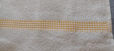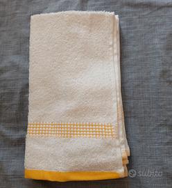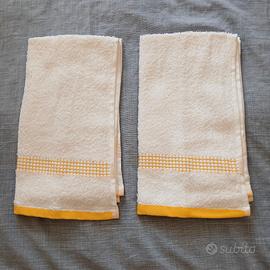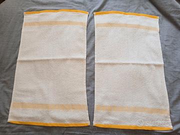 2 asciugamani in spugna Caleffi, qualità top, color bianco con bordini e righini gialli. Nuovi di negozio, mai, MAI, usati, non c'è cartellino perché li ho comprati in negozio esattamente così.. Misure (come si vede in foto): cm 52x32.