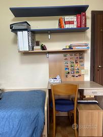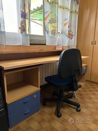 •Ampia scrivania con cassettiera integrata, sedia e mensole a muro stile libreria