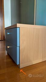 due comodini colorati in legno: uno arancione, uno azzurro due cassetti altezza: 39 cm larghezza: 51 cm profondità: 46 cm altezza ciascun cassetto: 17 cm come visibile in foto, il comodino azzurro è rovinato nella parte inferiore -consegna a mano-