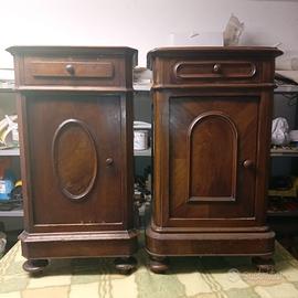 Coppia di comodini di legno con qualche segno 90€. Coppia di sedie sempre in legno in buone condizioni 90€. Tutti e quattro i pezzi 130€.