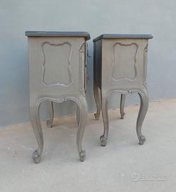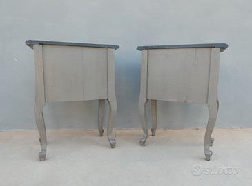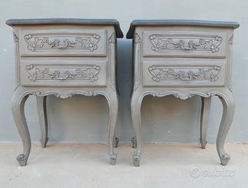 Coppia di comodini mobiletti tavolini dotati di due cassetti frontali, laccati e rifiniti con la tecnica “Shabby Chic” che prevede l’uso di colori chiari in superficie e colori scuri che affiorano dopo il trattamento d’usura. La struttura si presenta semplice ed armoniosa, e vanta proporzioni sapientemente equilibrate. La ricerca di un decoro mirato si riflette, in particolar modo, sulla scelta d’impreziosire il corpo con delicati intagli, caratteristici del gusto provenzale. Epoca seconda metà ‘900.