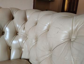 Coppia di divani vintage in stile Chesterfield due posti in pelle color bianco panna.
