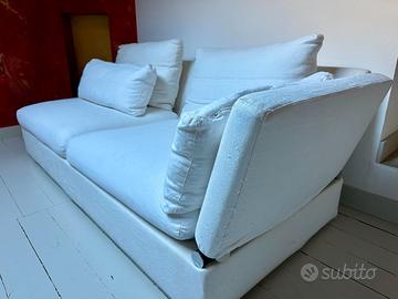 Struttura in acciaio, imbottitura in piume, rivestimento in tessuto 100% cotone crema (verso il bianco). Interamente sfoderabili (anche la base), lavabili in lavatrice e stirabili. Larghezza della base cm 190 profondità 83 altezza max cuscini 82. Altezza della seduta cm 40. Il bracciolo è reclinabile in due diverse posizioni per personalizzare la seduta. Con la reclinazione massima (stile letto) la larghezza aumenta a cm 240. Trasporto a vostra cura
