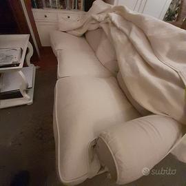 Vendo due divani in piumino d'oca, color crema, realizzati artigianalmente. Sono dotati di copridivani in stoffa. Imbottitura integra, come nuova; sono in buono stato, ma in alcuni punti il rivestimento sottostante presenta segni di usura - il tessuto è usurato o presenta piccoli strappi; i copridivani sono integri.