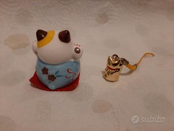 Set di due gatti portafortuna, uno più grande in ceramica e uno più piccolo dorato in metallo.