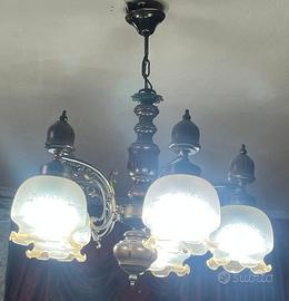Due Splendidi lampadari vintage a 5 luci, in legno tornito e metallo color ottone, con paralumi in vetro satinato inciso e bordo ondulato.