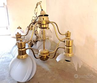 Lampadario vintage ottone da soffitto dorato con 5 luci ampolle in vetro molato, satinato e decorato con motivi floreali, . Struttura e bracci in ottone lucido.