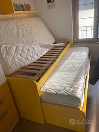 Vendesi due letti singoli a scomparsa entrambi con le rotelle scorrevoli. Sono in ottime condizioni con reti in doghe di legno e due materassi in schiuma h 22cm completamenti sfoderabili.