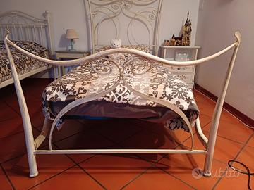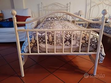 Due letti una piazza in ferro battuto con materasso a doghe in legno lunghezza 200, larghezza 90, colore bianco. il primo con testiera altezza max 107 e pediera 76, l'altro altezza max testiera 130 e pediera 70. Ottime condizioni. Eventuale materasso a corredo. Il primo vendo a 180 euro il secondo a 220 euro