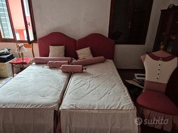 Letti singoli imbottito rivestiti sfiderabili e lavabili: due letti in doghe tessuto sfoderabile lavabile, disponibili separatamente copriletti bordo code di topo cuscini a caramella, due poltroncine puff servomuto miapribili e sfoderabile due lampade stesso tessuto. 130 i letti a testa,