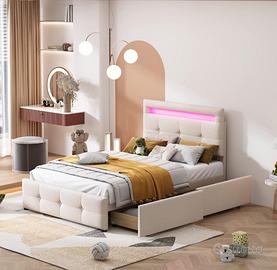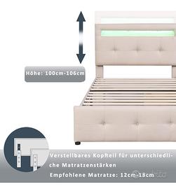 Letto singolo imbottito 90 x 200 cm, con 2 cassetti, luci a LED, imbottitura in lino. Colore beige. Due pezzi disponibili. Come nuovo. Causa trasloco 150 euro cadauno