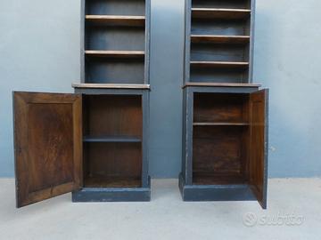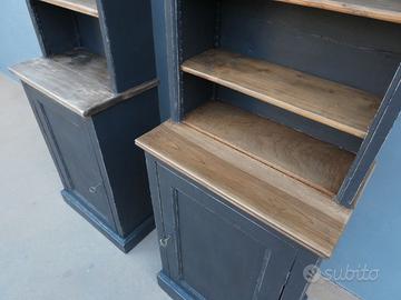 Due (simili – non in coppia*) librerie mobili scaffali corredate da una parte superiore con ripiani a vista e una parte inferiore con un’anta chiusa, realizzate in legno e rifinite con la tecnica “Shabby Chic”. Ciò che rende originale questi mobili, oltre alle loro particolari dimensioni, è il gioco contrastante di colori dato dalla lacca scura utilizzata per i corpi e i dettagli, lasciati a legno naturale. Non sono smontabili – realizzate in un corpo unico.